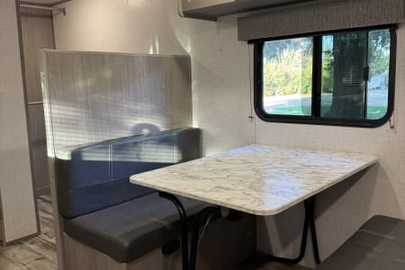 The trailer accommodates 1 - 3 adults, or a family of 4 if you have smaller children that can get cozy on a dinette conversion. It has a powerful hot water heater for showers and cleanup, two range stove, and a sizeable fridge for supplies!