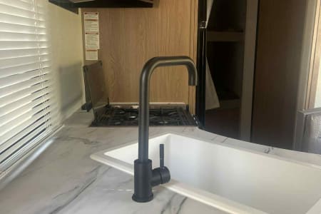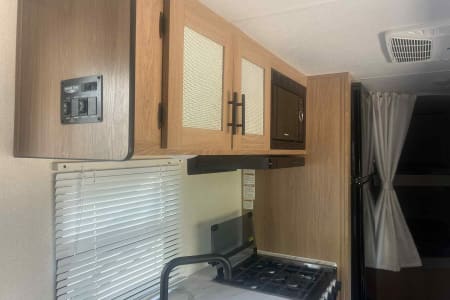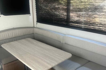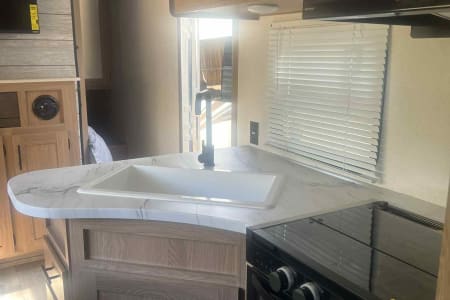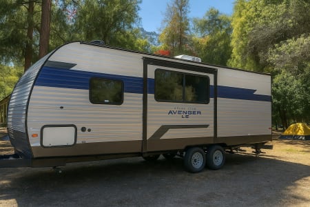 Experience comfortable camping with our 2023 Prime Time RV Avenger LE 24BHSLE, a beautiful travel trailer available for rental. This 28-foot unit accommodates up to 8 guests with double bunk beds, a plush queen bed, and a U shaped dinette that doubles as extra sleeping space or a gathering spot. The interior features a fully equipped kitchen with a stovetop/oven combo, deep farmhouse sink, microwave, and 12 volt refrigerator. It includes an aerodynamic front profile for smooth towing, electric stabilizer jacks for quick setup, sturdy steel steps for safe entry, and a heated underbelly for cooler temps. Fully stocked with essentials like hot and cold water systems, this RV delivers premium ideal for groups craving adventure. Book now for your next road trip!