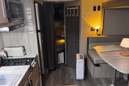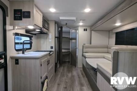 Enjoy a bright, modern interior with woodgrain finishes and LED lighting throughout. The main queen bed features a plush mattress with privacy curtain, while the double bunks are perfect for kids or extra guests. The slide-out dinette gives you added room to dine, play games, or just kick back and relax.