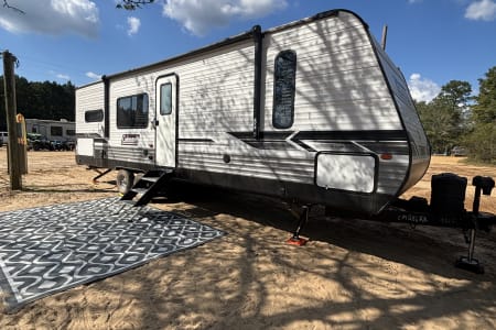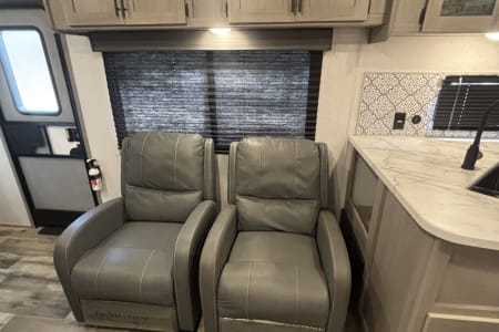 This travel trailer features a rear kitchen layout with tons of counter space, a full-size sink, three-burner stove, oven, microwave, and refrigerator — everything you need to cook like you’re at home. The open living area includes a large slide-out, cozy sofa, and dinette that converts into extra sleeping space. The private master bedroom up front has a walk-around queen bed with storage on both sides for your clothes and gear.