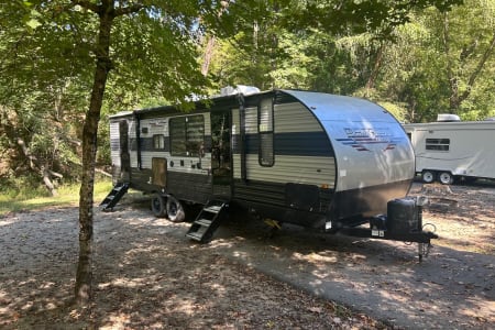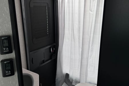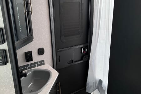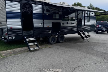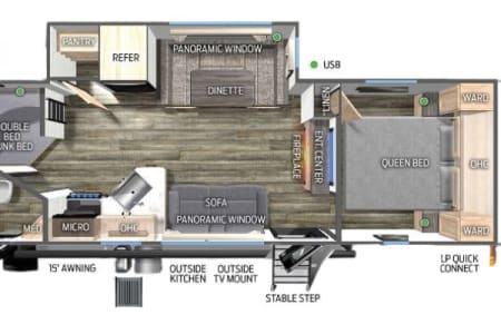 Experience the comfort of the Cherokee Patriot 2, designed to accommodate 6 to 8 guests effortlessly. This stunning space features a large refrigerator and a walk-in pantry, perfect for all your culinary needs. Enjoy the comfort of a queen bed suite, double bunk beds, and a chef-select black stainless steel kitchen suite, completed with a U-shaped dinette and a residential farm-style sink. Relax by the fireplace while watching your favorite shows on the 50" TV, and unwind in the tub-shower combo, all designed for your ultimate comfort and convenience. Enjoy this Campers convenience and space, ensuring a memorable trip for everyone.