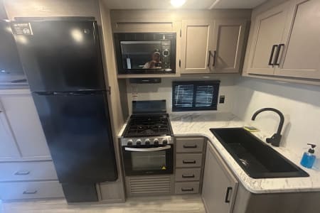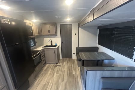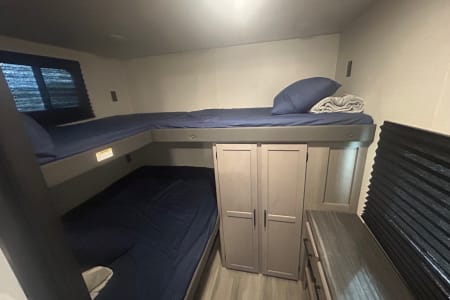 If you enjoy camping with extra friends and family, this travel trailer will be perfect for you! There is a rear bunkhouse with double bunks and a queen, a dresser, plus a closet, making this room perfect for guests. Up front you'll find the private bedroom with a queen bed, dual nightstands and dual closets for your things, and the full bath is close by for convenience. The chef of your group will have a burner cooktop to prepare meals, ample counter space, plus a pantry for dry goods and snacks. Your crew can play a game at the booth dinette or relax on the sofa while dinner is being made, or they can relax outdoors under the 16' power awning!