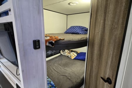 This camper has full size bunks with a front bedroom. The slide out gives extra floor space. Everything you need for a family vacation or extended stay.
