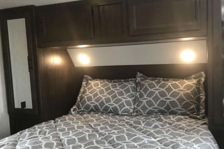 Experience the comfort of the Cherokee Patriot 1, designed to accommodate 6 to 8 guests effortlessly. This stunning space features a large refrigerator and a walk-in pantry, perfect for all your culinary needs. Enjoy the comfort of a queen bed suite, double bunk beds, and a chef-select black stainless steel kitchen suite, completed with a U-shaped dinette and a residential farm-style sink. Relax by the fireplace while watching your favorite shows on the TV, and unwind in the tub-shower combo, all designed for your ultimate comfort and convenience. Enjoy this Campers convenience and space, ensuring a memorable trip for everyone.