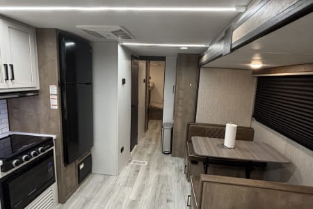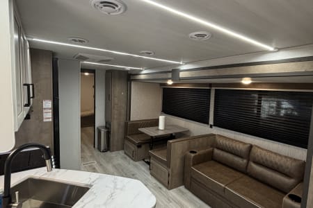 • Spacious living area – Large slide-out with booth dinette and sofa, providing plenty of room to dine or unwind.
