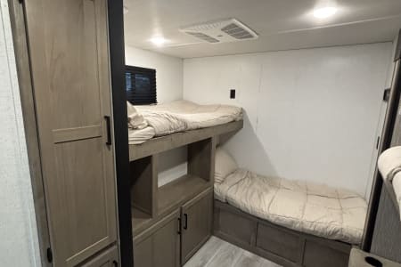 • Private bunk room – Features multiple bunks and flip-out cushions, giving kids or guests their own space to relax.