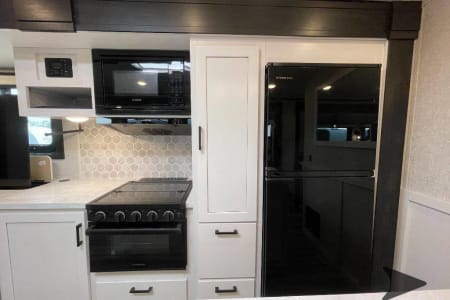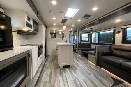The kitchen’s got everything you need, including seamless countertops, a stainless-steel sink with a pull-out sprayer, and a big 11 cu. ft. fridge that runs on 12V power. There’s plenty of space to store food and gear, plus a microwave and stove for cooking inside — or you can use the outdoor kitchen when the weather’s nice!