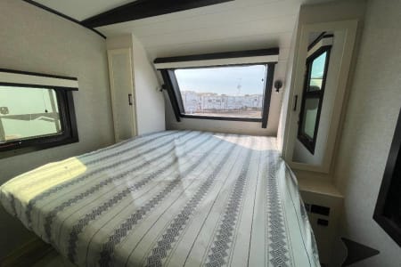 The front bedroom is one of our favorite parts — it’s got a full walk-around queen bed (60x80) and a big window that lets in tons of natural light. Perfect for cozy mornings or catching a nap after a long day outside.