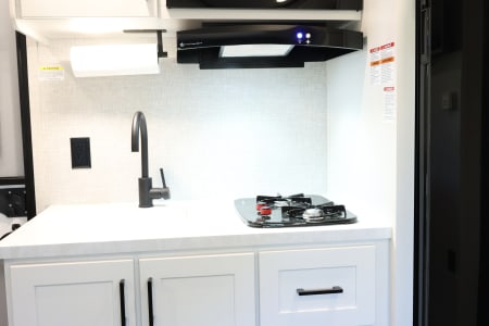 Chef’s Station: 2-burner range, microwave, and a deep residential-style sink.