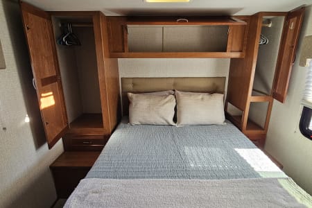 ✔ Room for Everyone – Sleeps up to 7 with a queen over-cab bed, a full-sized comfy convertible couch, and a twin-sized dinette. Ideal for kids, teens, or a friends’ weekend away.