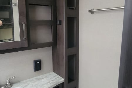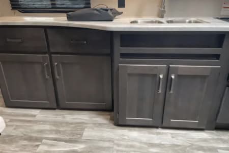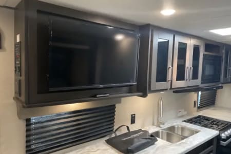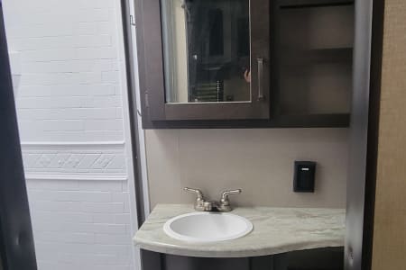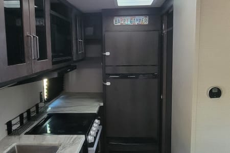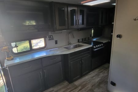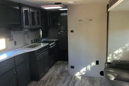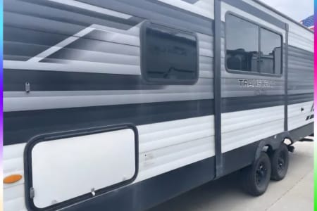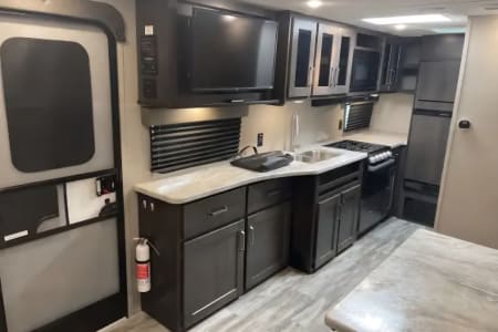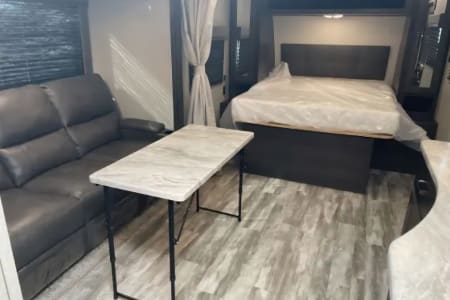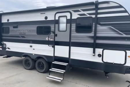This is the perfect travel trailer to get away in. The camper sleeps 3 and has a ton of space to move around easy and bring along everything you need. The couch has two recliners and also will create a bed.