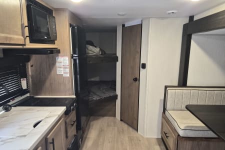 Brand new 2025 forest river wolf pup thats great for all your family outings. Can comfortably sleep 5 people. Driver side slide out for some more inside room. Dinette turns into a full size bed along with bunk beds. Small enough where most can get around no problem but still enough room for the family to enjoy.