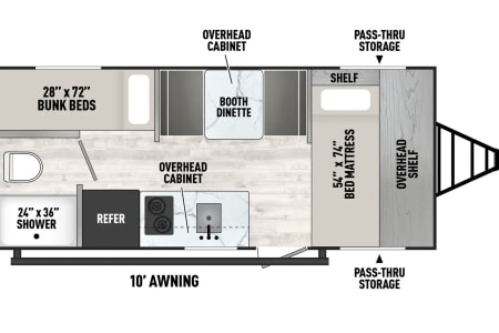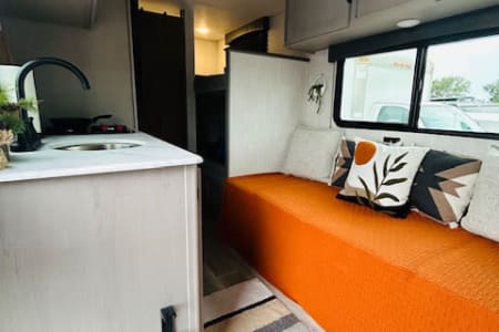 Inside, you’ll find a clean interior with everything you need to feel right at home on the road. The efficient floorplan includes a comfortable sleeping area, a well-equipped kitchenette (with stove, sink, and refrigerator), and a surprisingly roomy dinette that converts for extra sleeping space. Plenty of storage throughout keeps your gear neatly organized.