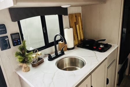 The bathroom is compact but fully functional, and the climate control system keeps the trailer comfortable in any season. Outside, enjoy the convenience of a lightweight design, stable towing experience, and useful exterior storage. Perfect for weekend trips, state park stays, or long cross-country travel.