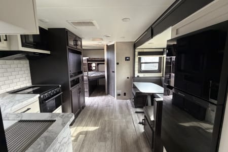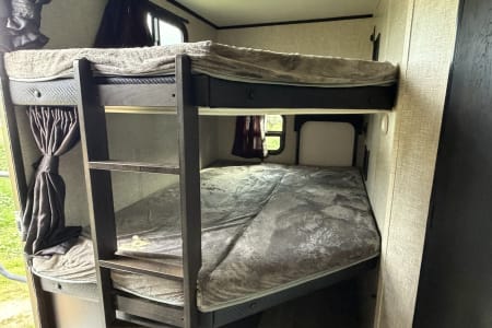 • Sleeps up to 7 with a queen-size bed, dinette conversion, and full size bunk beds