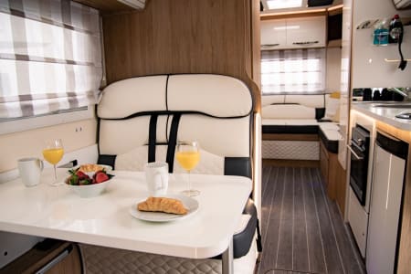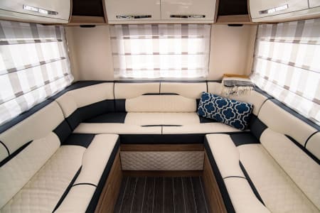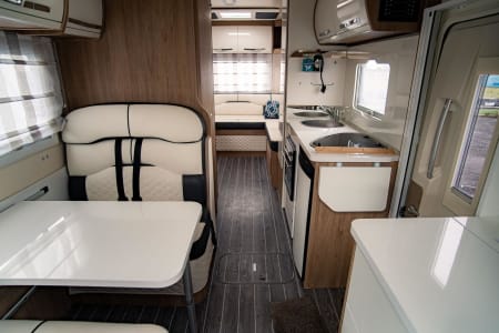 The 747 features a large rear U-shaped lounge that converts into a comfortable double bed. At the front, the dinette converts into a double bed, while an electric drop-down double bed above the dining area can be easily lowered at the touch of a button.