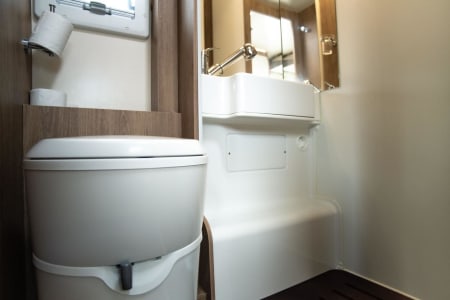 Inside, you’ll find six comfortable sleeping berths, a well-designed living area, and a fully equipped kitchen with hob, fridge/freezer, and sink, making meals on the road simple and enjoyable. The bathroom includes a shower, toilet, and washbasin, giving you the freedom to travel without relying on campsite facilities.