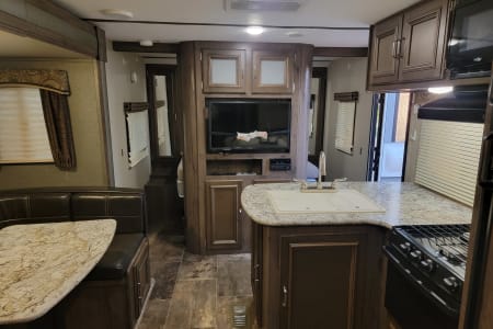 Modern style, tons of storage space, 2 full/oversize bunkbeds, Queen Master, dining table converts to full size bed, 2 flatscreen tv's, big bathroom, outdoor kitchen, large awning.