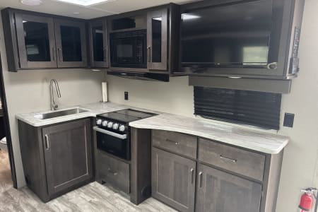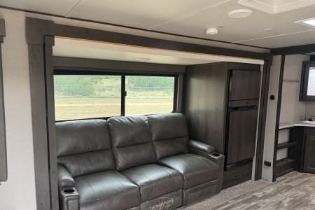 Have a big family? This camper is perfect for you! You can sleep up to 9 people in this camper. You can enjoy dry camping or enjoy camping with hookups with all the amenities. This camper has one slide out with a theater seating couch, 32" TV to relax in the evenings. You can hook up a stove outside with a quick propane hookup underneath the awning or cook inside with an oven and 3 burner stove. Table inside can convert from kitchen island for kitchen prep or coffee table for your relaxation time.