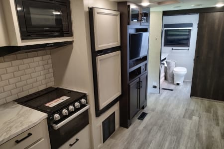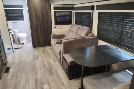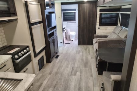 The Modern Farmhouse interior feels like a boutique hotel, not a cramped camper. You’ll love the massive rear bathroom—no more cramped campground showers—and the outdoor kitchen that lets you enjoy the fresh air while you prep breakfast.