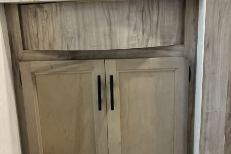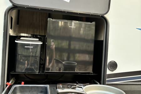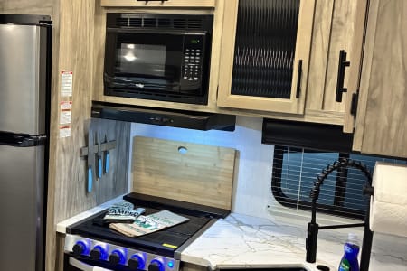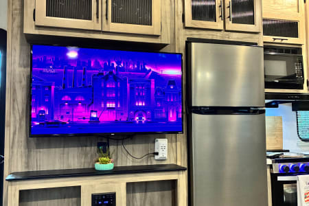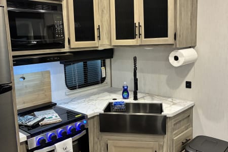 The unit comes with a fully equipped kitchen with a farm style sink, cups, dishes, kitchen utensils, cookware, coffee maker, air fryer, and waffle maker. If you feel like grilling out, no worries with the deluxe outside kitchen. It's equipped with an outside fridge, ice maker, sink, and a 2-burner stove. Kick back and relax for a movie night with the toasty fireplace setting the perfect vibe. Just pack your clothes, food, and any personal belongings—and let the fun begin!