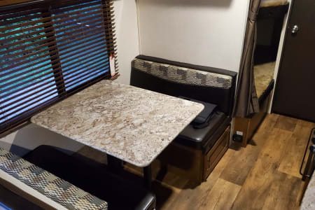 campsite windows, bench dinette, sofa, and a fully appointed kitchen with