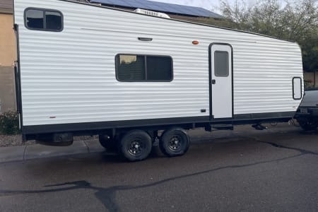 Solar to keep the batteries up to par, 12V refrigerator to keep things cold , 12v usb ports throughout, 12v Smart TV, dvd, and Bluetooth music .