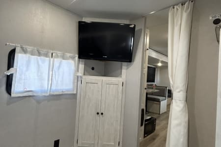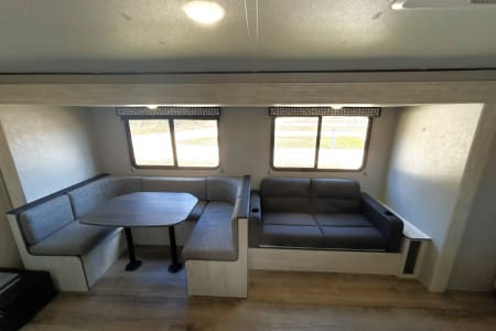 This spacious bunkhouse floorplan is perfect for large families or groups exploring the Hill Country, state parks, or attending summer festivals and events. With sleeping space for up to 9, a fully equipped kitchen, and a rear entertainment center, the Texas Triple Chill delivers all the comforts of home while you're on the road.The triple A/C setup means you'll never fight over the thermostat—front bedroom stays cool, living area stays cool, and the bunk room stays cool. No more hot, sleepless nights or uncomfortable afternoons.