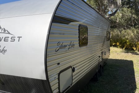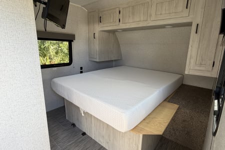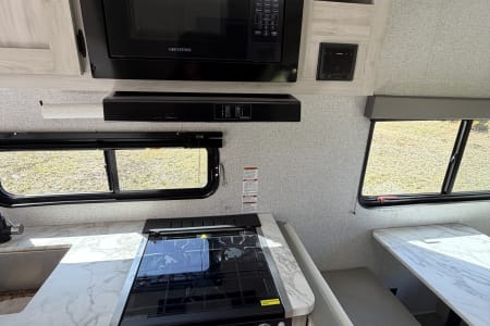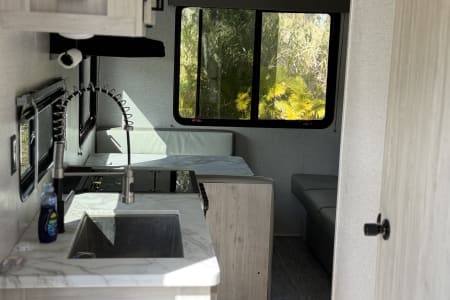 Our 2023 East to West Silver Lake 20KRD is a bright, airy sanctuary designed for those who don’t want to sacrifice style for adventure. The centerpiece of this unit is the massive panoramic rear window, which fills the living area with natural light and offers an incredible view of your surroundings—perfect for watching the sunrise from the comfort of your kitchen.