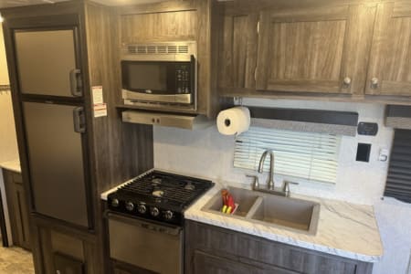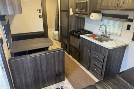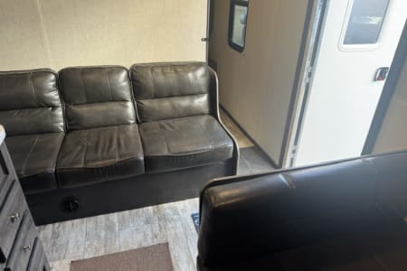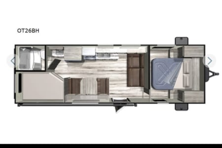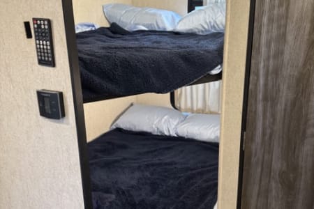 *No Burning Man Rentals* Nice well kept bunkhouse travel trailer. Will sleep 6-8 people, between the queen bed up front, the two bunks in the back, the fold down couch, and the dinette turning into a bed. Comes with the basics for 4-6 people, linens, pillows, dishes, utensil, towels, claiming supplies, soap, etc. Also comes with all the connection supplies: power cord, water hose, dump hose, level blocks, etc. The trailer also has a 3 battery set up for extra battery life. It has dual 7 gal propane tanks. This is a good rig for boon-docking. To top it off, a custom bumper mounted BBQ can be added to the rental. Pets are ok, as long as they are not on the beds or furniture. A additional cleaning fee will be added if any fur is found on the furniture / beds.