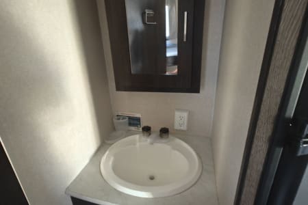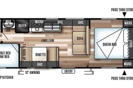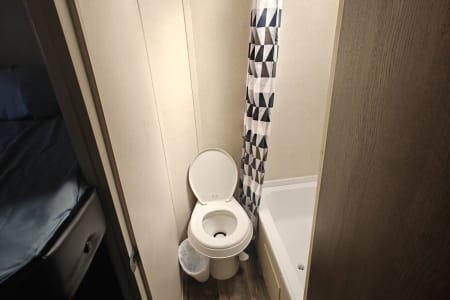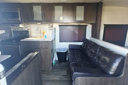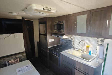 The fully equipped kitchen makes meal prep simple with a stove, oven, microwave, and refrigerator. A full bathroom with shower adds convenience, and ample storage throughout ensures you have space for all your gear. Lightweight and easy to tow, this bunkhouse is a great option for families looking for comfort without the size of a larger trailer.