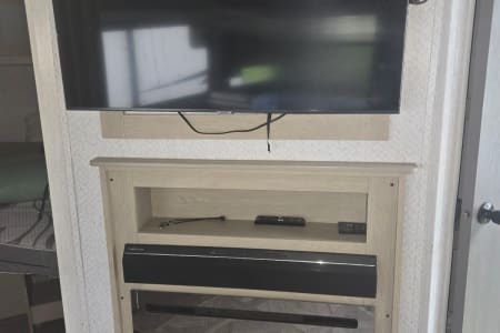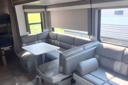 The private front master bedroom includes a queen bed with overhead storage. In the rear, double-over-double bunk beds offer generous sleeping space for kids or guests. The large slide-out expands the main living area, giving you room to relax, dine, and unwind comfortably.