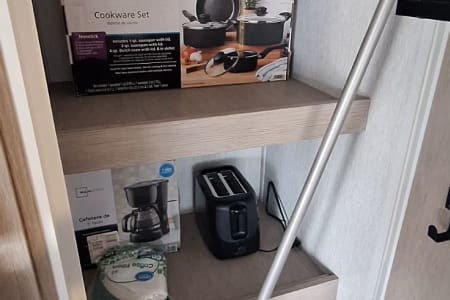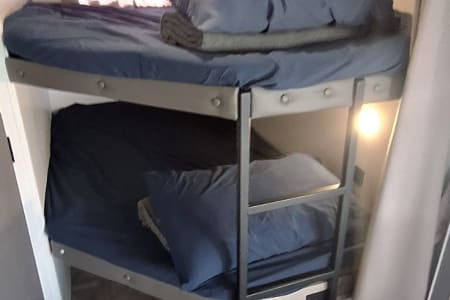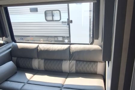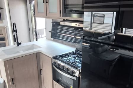 The fully equipped kitchen features a refrigerator, stove, oven, microwave, and ample cabinet storage. A full bathroom with shower and toilet provides convenience on the road. Climate control with A/C and heat ensures year-round comfort.