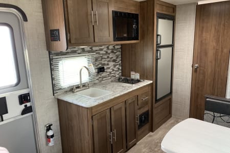 Easy to tow travel trailer with a queen bed up front and two bunks in the back. The dinette and sofa are also for sleeping but, ideally for kids or shorter adults.