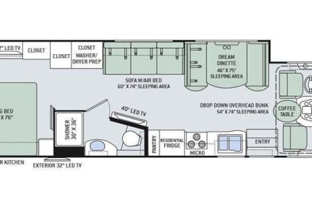 Inside, you’ll find multiple smart TVs throughout the coach, a cozy living area with a retractable TV and fireplace, and plenty of room to relax. Outside, the RV features a full underbody neon lighting kit, giving it a unique glow at night — perfect for campsites or events.