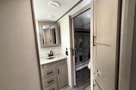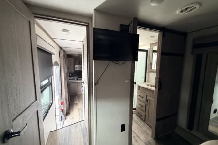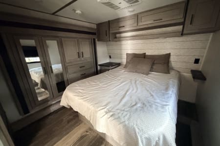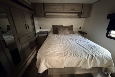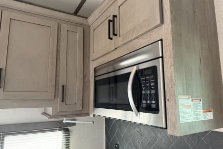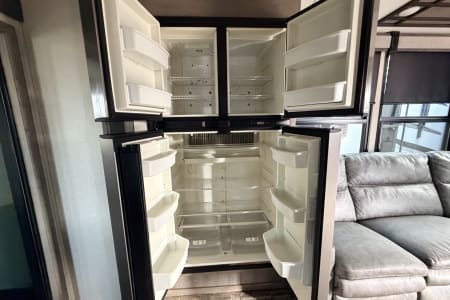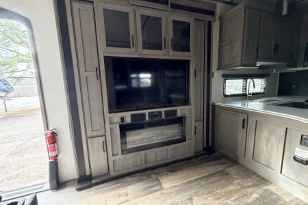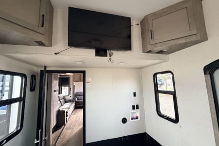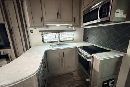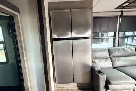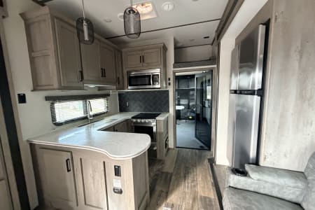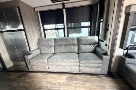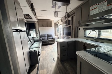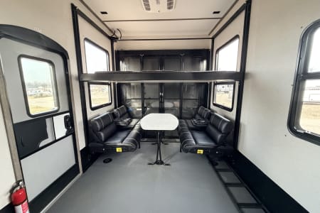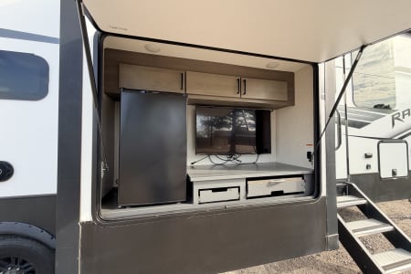 You will have everything you need after your hikes, dirt bike rides, and family walks around the campgrounds when you have this Raptor toy hauler! From the outdoor kitchen and TV, the fuel tanks, and the two electric awnings with LED lights, to the queen-size bed and the double-entry bathroom, there is comfortable camping throughout. The main living area offers seating with recliners for five, and the U-shaped kitchen countertop allows you to make meals without having to move for anyone walking around. The garage provides sleeping space for four with opposing sofas and an electric bunk, and there is a space prepped for a washer/dryer, overhead cabinets, and much more!