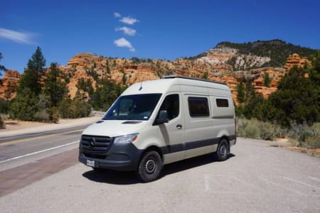 We've taken this Rig all over Southern Utah, and we love sharing the Rig with other red rock explorers. This Rig is powered by two solar panels, allowing you to skip the campgrounds and electricity/water hookups. It also includes tons of storage space, stove, oven, fridge, sink, toilet, heater, Jackery, and a memory foam mattress on a full-size bed. This van has a hitch with wiring (tows up to 5,000 lbs). It's also a diesel drivetrain and will get you, on average, 20+ mpg.