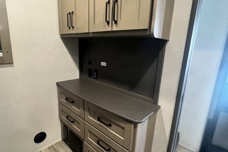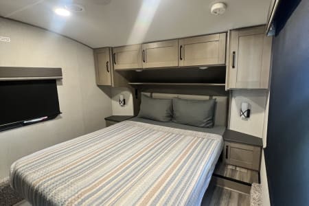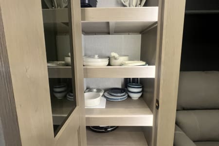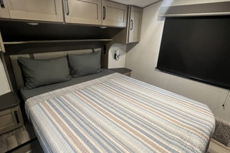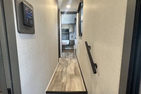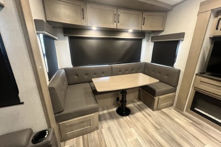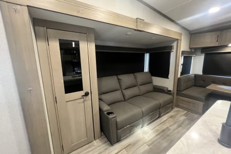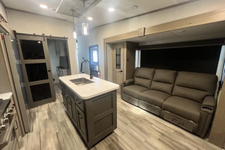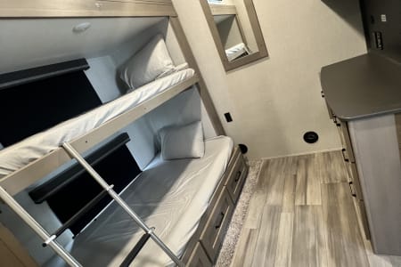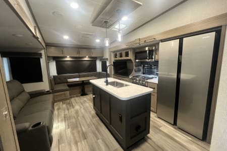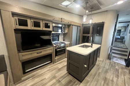 Living Room / Main Area 78″ triple theatre seating – recliners ideal for watching TV or relaxing. 92″ U-shaped lounge that can also function as a sleeping area. Entertainment center with a 40″ LED TV and fireplace (standard). Bunkhouse / Mid Room Middle bunkhouse area with two bunks, ideal as a second bedroom or versatile space (office/den). Master Bedroom Private front bedroom with a queen bed Walk-around bed design enhances accessibility. Kitchen & Dining Residential-style kitchen with: Deep stainless steel sink with high-rise faucet and pull-out sprayer. 16 cu ft 12V refrigerator (residential size) 3-burner cooktop and oven. Ample counter space and pantry storage.