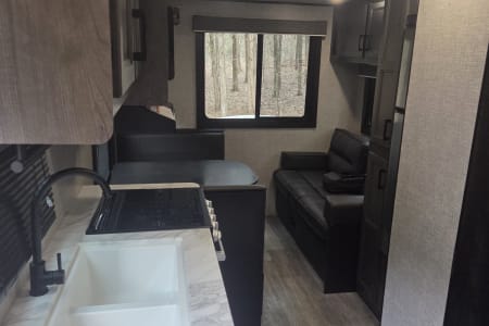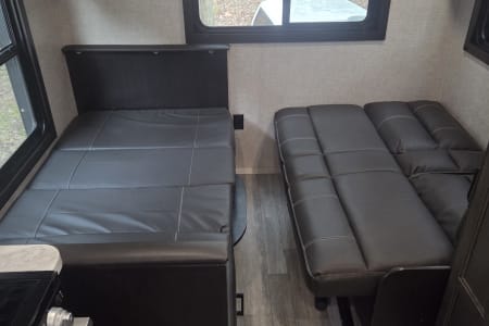 The camper features a comfortable queen bed in the front, a jackknife sofa and dinette that both convert into an additional sleeping areas, making it ideal for up to 4–5 guests. The kitchen includes a refrigerator, stove and microwave. Also has a full bathroom with sink, toilet and shower.