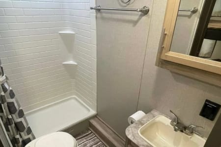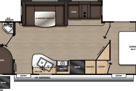 The 263BHS is a classic family bunk house floorplan. Plenty of sleeping is provided by a queen bed in the private master bedroom, two spacious double-over-double bunk beds, as well as our extra-large U-shaped dinette and jiffy bed sofa. Well thought-out features including the easy view angled entertainment center, generous kitchen pantry and standard outside camp kitchen. Additional storage spaces include the under-bunk cubby and floor-to-ceiling closet in the master bedroom.