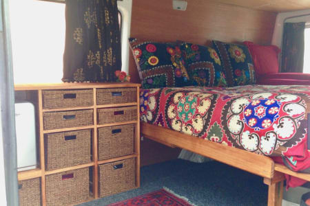 Inside the van is a queen bed with a real innerspring mattress, quality linen, goose down doona and beach and bath towels are provided.